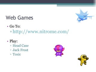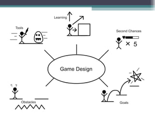 The document provides an overview of key concepts in web games, including goals, obstacles, tools, second chances, and learning. It asks the reader questions about their favorite games and discusses the goals players want to achieve in games. The document also contains activities where readers are prompted to create game ideas using the concepts discussed, with examples like having a cake as a goal and a pencil as an obstacle.