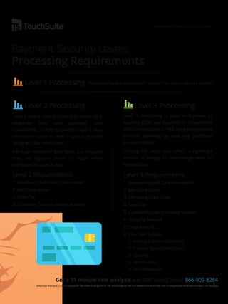 The document discusses the potential savings for B2B and B2G businesses by utilizing level 2 and 3 data in payment processing, which can reduce interchange costs by over 1%. It emphasizes the importance of proper categorization of transactions to avoid overpayment and highlights the technology solutions offered by TouchSuite to optimize rates and enhance security. Additionally, it provides details on the requirements for level 2 and 3 processing to facilitate significant savings.