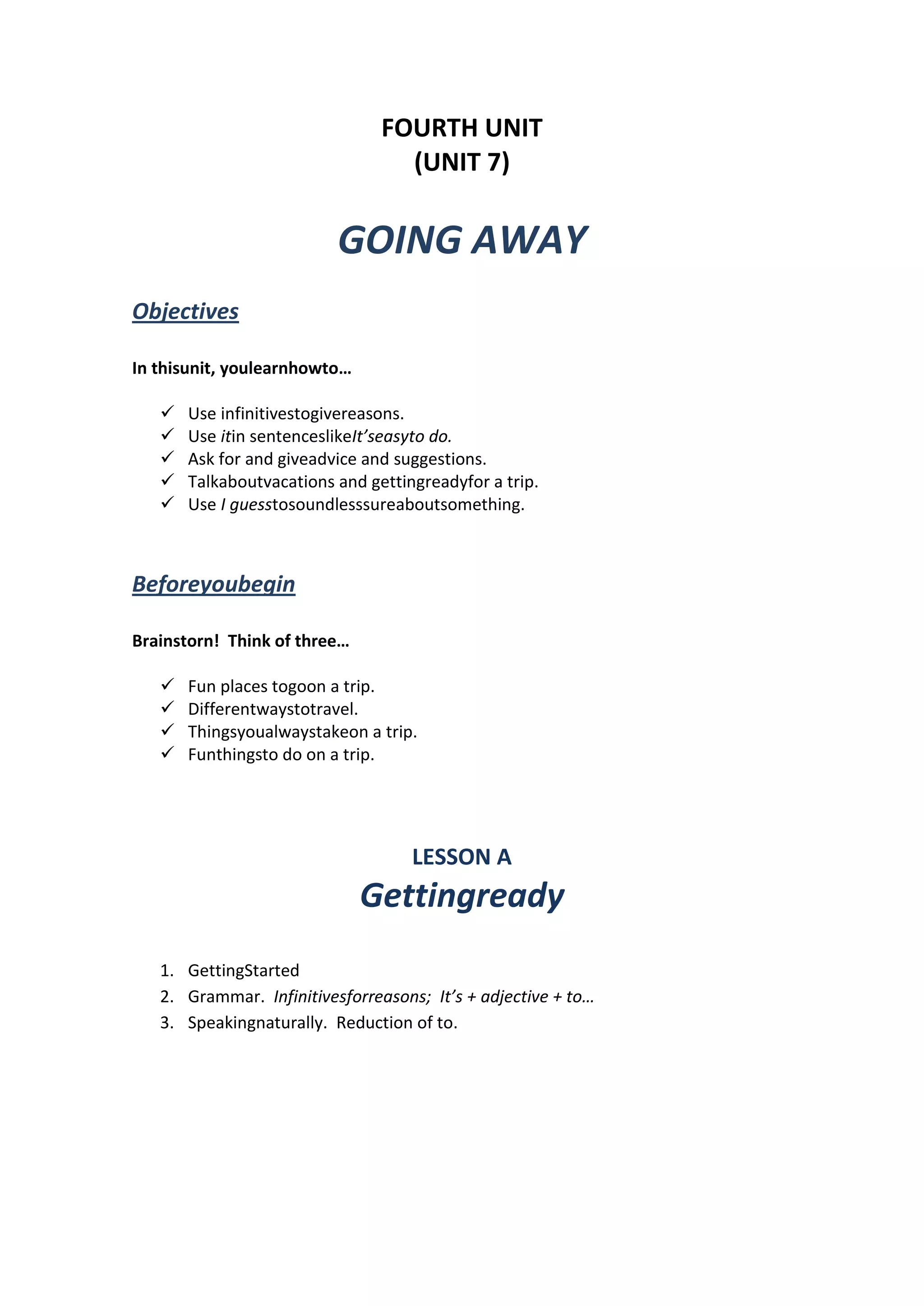 This document outlines the objectives and lessons for a language learning unit about going on trips and vacations. The unit teaches how to give reasons using infinitives, ask for and give advice and suggestions about trips, and talk about getting ready for a vacation. It contains four lessons that cover topics like getting ready, things to remember, responding to suggestions, and discussing interesting travel destinations.