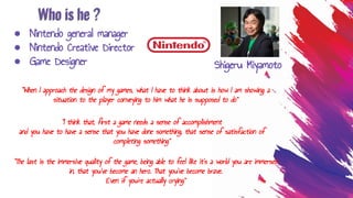 This document discusses the principles of level design in video games, with a focus on the approaches used by Nintendo and the design philosophies of Shigeru Miyamoto and Takashi Tezuka. It outlines essential concepts such as player satisfaction, game mechanics, and narrative structures while highlighting the progression and challenges players face in levels. The document further compares other game design methodologies, exemplified by Kim Swift's work, emphasizing a consistent teaching and revealing approach throughout gameplay.