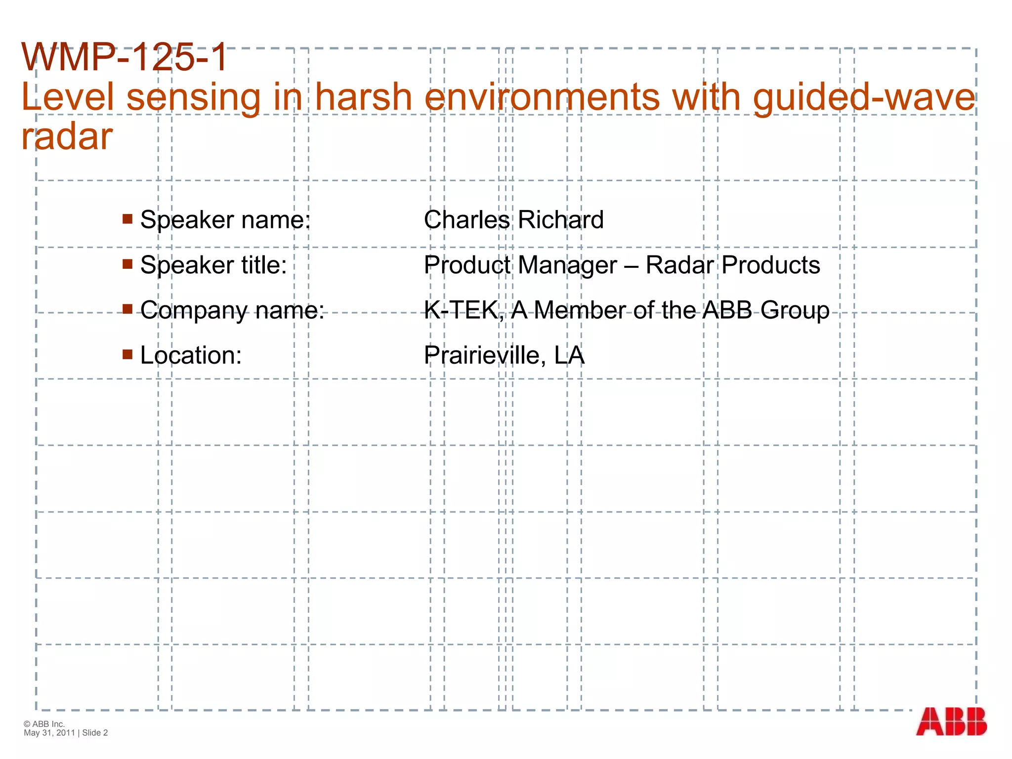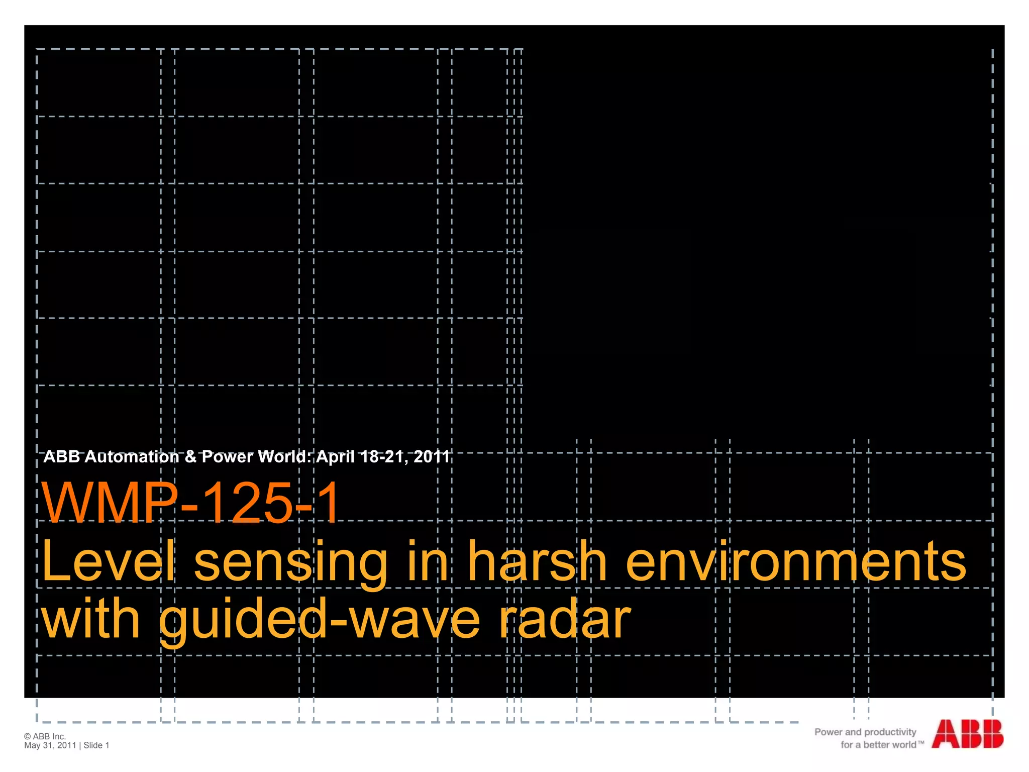 The document discusses level sensing technologies, particularly focusing on guided-wave radar (GWR) for use in harsh environments. It evaluates common methods such as differential pressure, capacitance, and ultrasonic measurements, highlighting their limitations and reliable applications. The talk aims to explain how GWR offers better reliability and performance in various challenging scenarios compared to traditional measurement techniques.