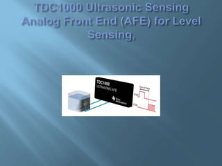 This document discusses ultrasonic level sensing using transducers that emit high frequency acoustic waves and measure the time-of-flight of reflected echoes to determine the distance to the surface of a liquid. It describes the basic working involving excitation of a start pulse and detection of a stop pulse, with the time difference providing the time-of-flight and corresponding distance. It also mentions that there is a blanking zone near the transducer face where objects cannot be detected. Finally, it notes this technology is used for level sensing in tanks, containers, and various industrial equipment.