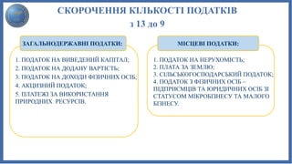 СКОРОЧЕННЯ КІЛЬКОСТІ ПОДАТКІВ