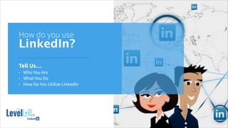 The document provides guidance on how to effectively use LinkedIn for business purposes. It recommends determining goals and target markets, optimizing your profile with keywords and relevant experience, and engaging and utilizing your network by connecting with potential leads and referral sources, using search and shared connections, and sharing valuable content through groups. The overall aim is to create real connections and build quality leads on LinkedIn.