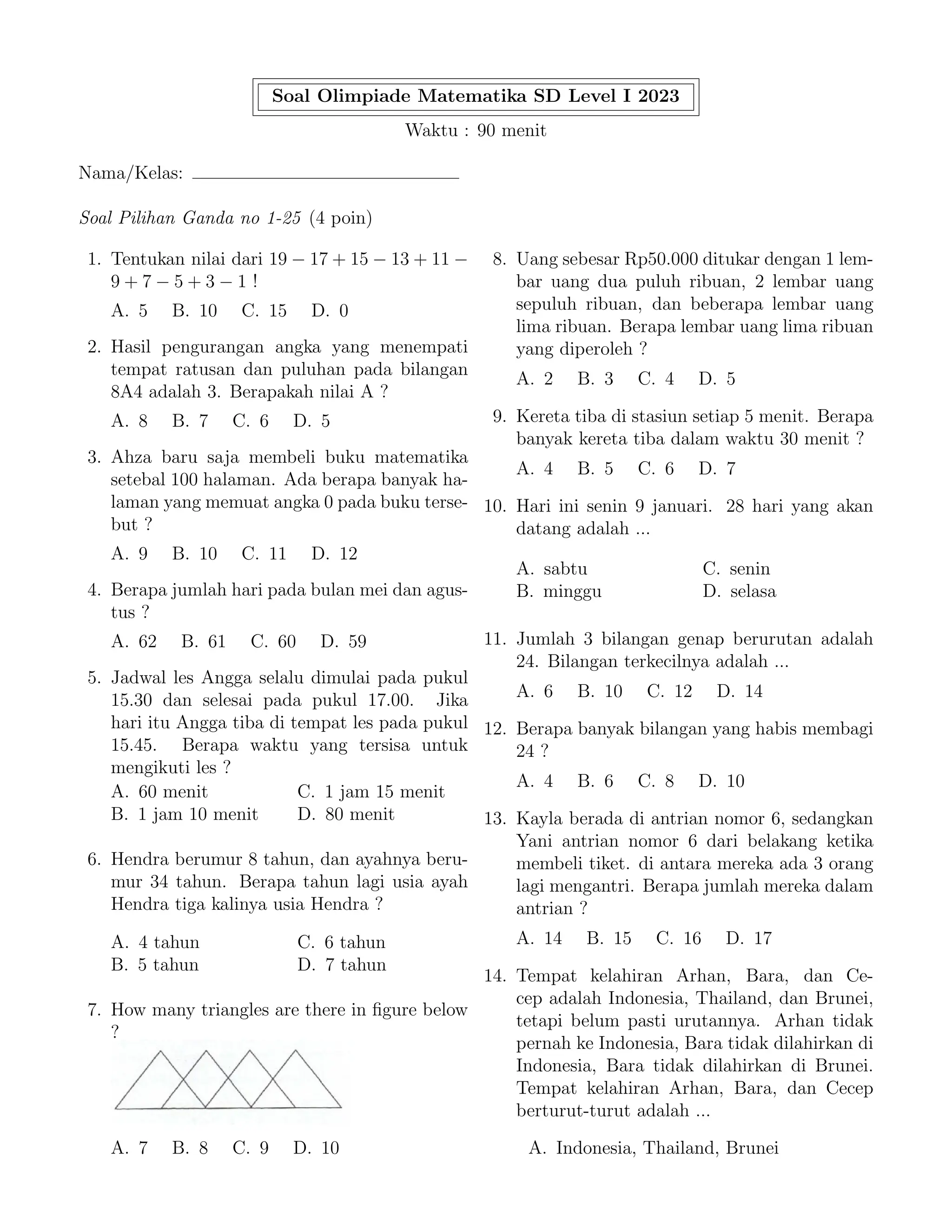 Dokumen ini merupakan soal olimpiade matematika untuk SD level I tahun 2023, terdiri dari soal pilihan ganda dan isian dengan total 28 soal. Soal mencakup berbagai topik matematika seperti aritmetika, geometri, dan logika. Peserta diberikan waktu 90 menit untuk menyelesaikan seluruh soal.