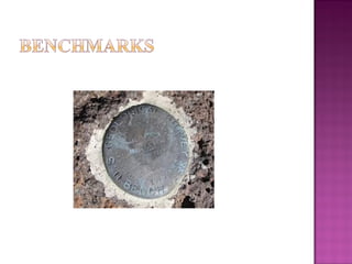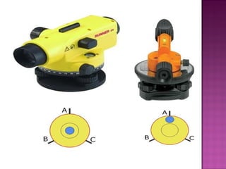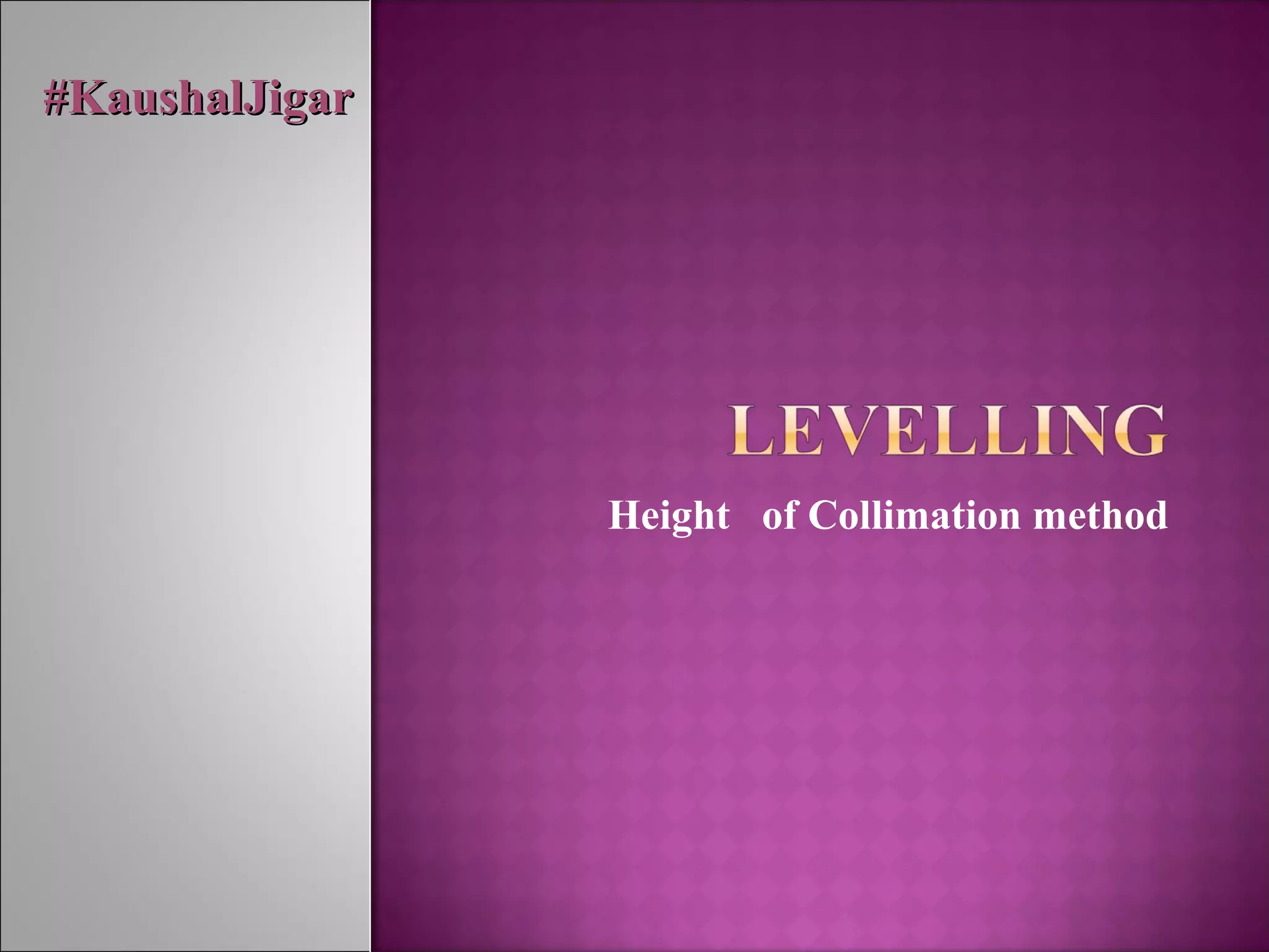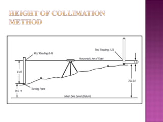 The document discusses the height of collimation method for leveling. It explains that a level is used to determine elevation differences between points by establishing a horizontal line of sight. A rod reading is taken on a point of known elevation to calculate the height of instrument. Then, rod readings of other points are subtracted from the height of instrument to determine their elevations. It also defines various leveling terms like backsight, foresight, benchmarks, and describes the leveling process.