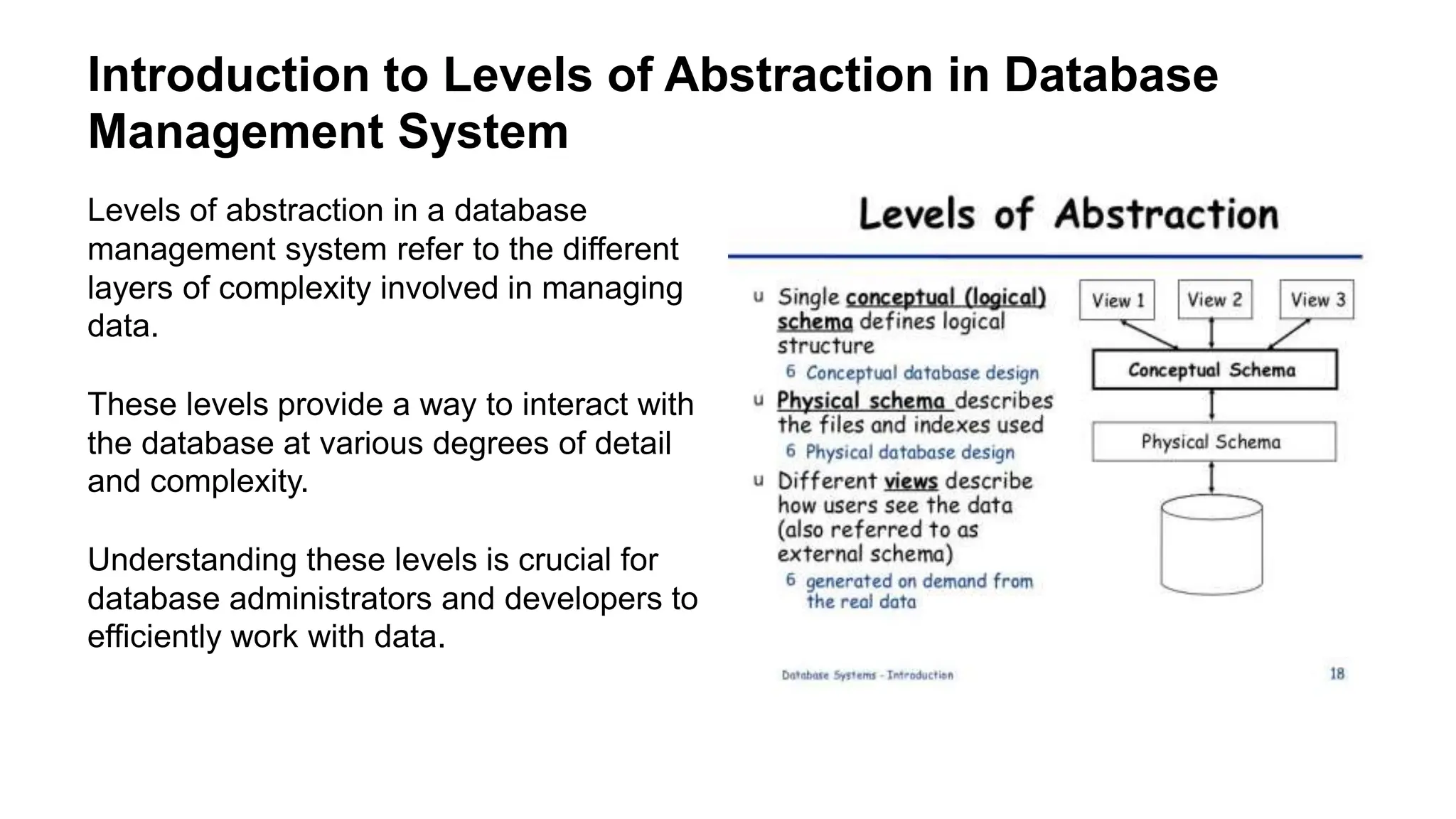 The document discusses the levels of abstraction in database management systems, which include physical, logical, and view levels, each playing a crucial role in data management and security. It highlights the importance of data independence, scalability, and maintenance across these levels, as well as the complexities and challenges involved. Understanding these levels is essential for administrators and developers to design efficient and user-friendly databases.