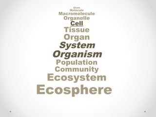 1) Atoms are the smallest part of matter and are non-living. 2) Molecules like water and salts are made of bonded atoms and are also non-living. 3) Macromolecules like proteins and nucleic acids form larger non-living structures. 4) Organelles are structures within cells like mitochondria. 5) Cells are the basic units of structure and function and are living. 6) Tissues are groups of cells that perform similar functions. 7) Organs are made of tissues that work together to perform specific functions. 8) Organ systems are groups of organs that coordinate related functions like the circulatory or