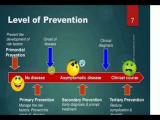 Prevention is better than cure. There are four levels of prevention: primordial, primary, secondary, and tertiary. Primordial prevention aims to prevent risk factors from arising in a population. Primary prevention removes the possibility of disease by addressing risk factors before onset. Secondary prevention halts disease progression through early detection and treatment. Tertiary prevention focuses on rehabilitation and reducing impairments and disabilities for those with advanced disease. The strategies of prevention include health promotion, specific protection, early diagnosis and treatment, disability limitation, and rehabilitation.