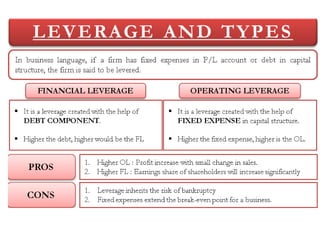 Leverage refers to a firm's use of fixed costs to increase returns to owners. There are two main types of leverage: financial leverage and operating leverage. Financial leverage involves using debt rather than equity to finance assets, which results in fixed interest costs. Operating leverage is using fixed costs in operations that do not vary with production volumes. Combined leverage looks at the relationship between sales variations and taxable income changes, taking into account both financial and operating leverage. Degrees of leverage are calculated to quantify the impact of a sales change on profits.