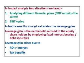 This document discusses different types of financial leverage used by firms, including short-term, medium-term, and long-term leverage as well as ownership and creditorship securities. It also discusses why firms employ borrowed funds through financial leverage, such as to gain tax advantages and earn returns higher than interest rates. Methods for calculating financial leverage ratios are presented, including debt ratio, debt-equity ratio, and interest coverage ratio. The impact of financial leverage on earnings per share, return on equity, and return on investment is explained through EBIT-EPS analysis. Operating leverage and its relationship to financial leverage in determining a firm's overall combined leverage and risk is also covered.