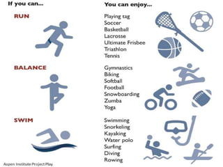 This document discusses the benefits of the American Development Model (ADM) for youth sports. It begins by outlining some commonly believed myths about early specialization, deliberate practice, and the "10,000 hour rule" that are contradicted by research. The ADM promotes sampling multiple sports at a young age and delaying specialization to reduce injury risk and allow well-rounded development. The document provides strategies for implementing ADM principles through child-centered programming, coaching education, and marketing youth sports in a way that emphasizes participation over early specialization.