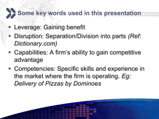 This document discusses how organizations can leverage capabilities in disruptive environments. It defines key terms like leverage, disruption, and capabilities. It describes how organizational capabilities focus on meeting customer needs and creating competitive advantages. Traditional sources of advantage are lower costs, product differentiation, and innovative technology. Capabilities provide customer value through responsiveness, relationships, and service quality. Disruptions can be technological or marketing innovations that create new markets and overtake existing ones. For organizations, disruptions can present threats or opportunities depending on factors like adaptability and innovation. Examples of disruptive strategies include low-cost airlines and new financial products. The document provides tips for leveraging disruption, such as learning from the market and identifying new opportunities.