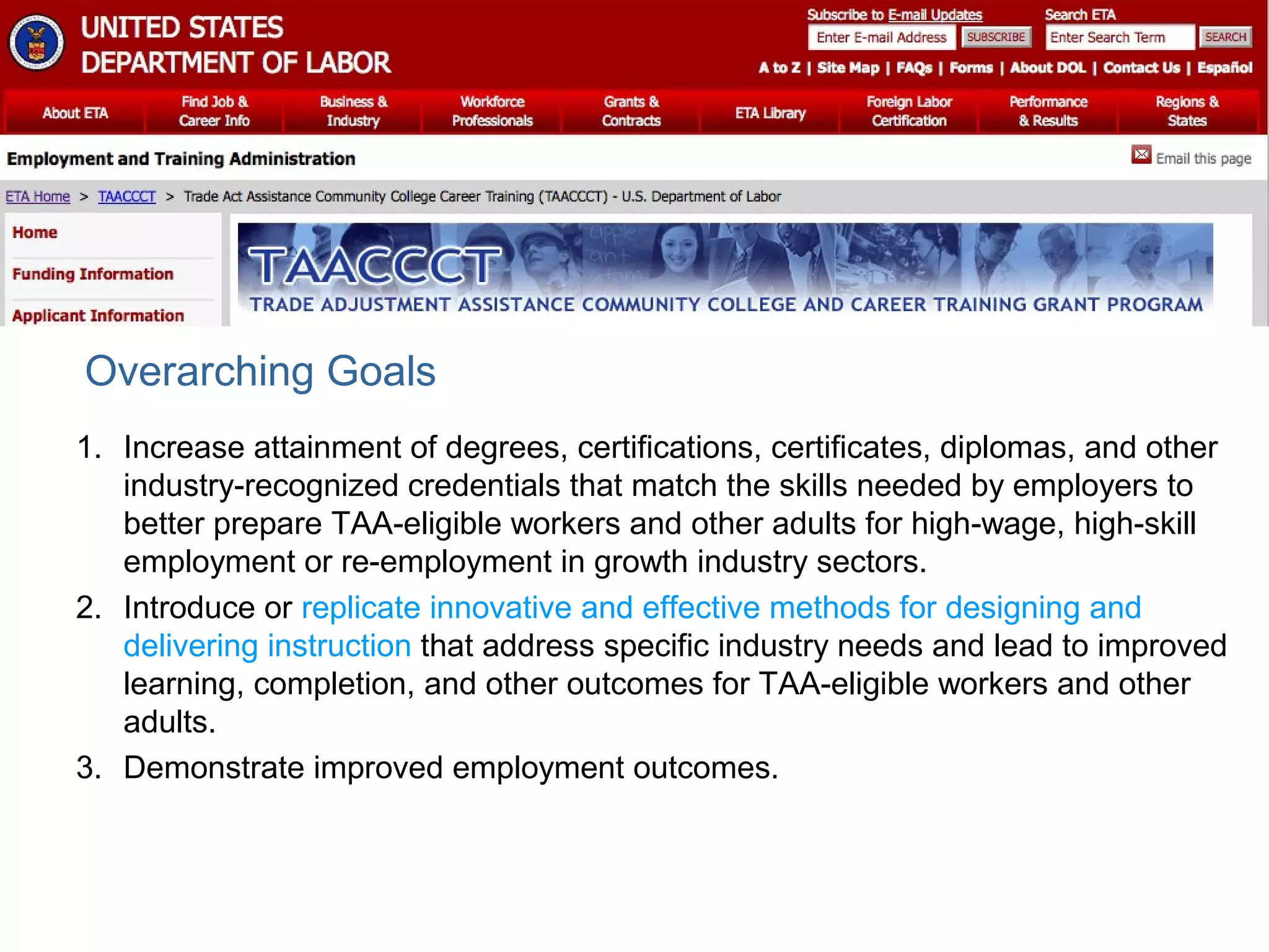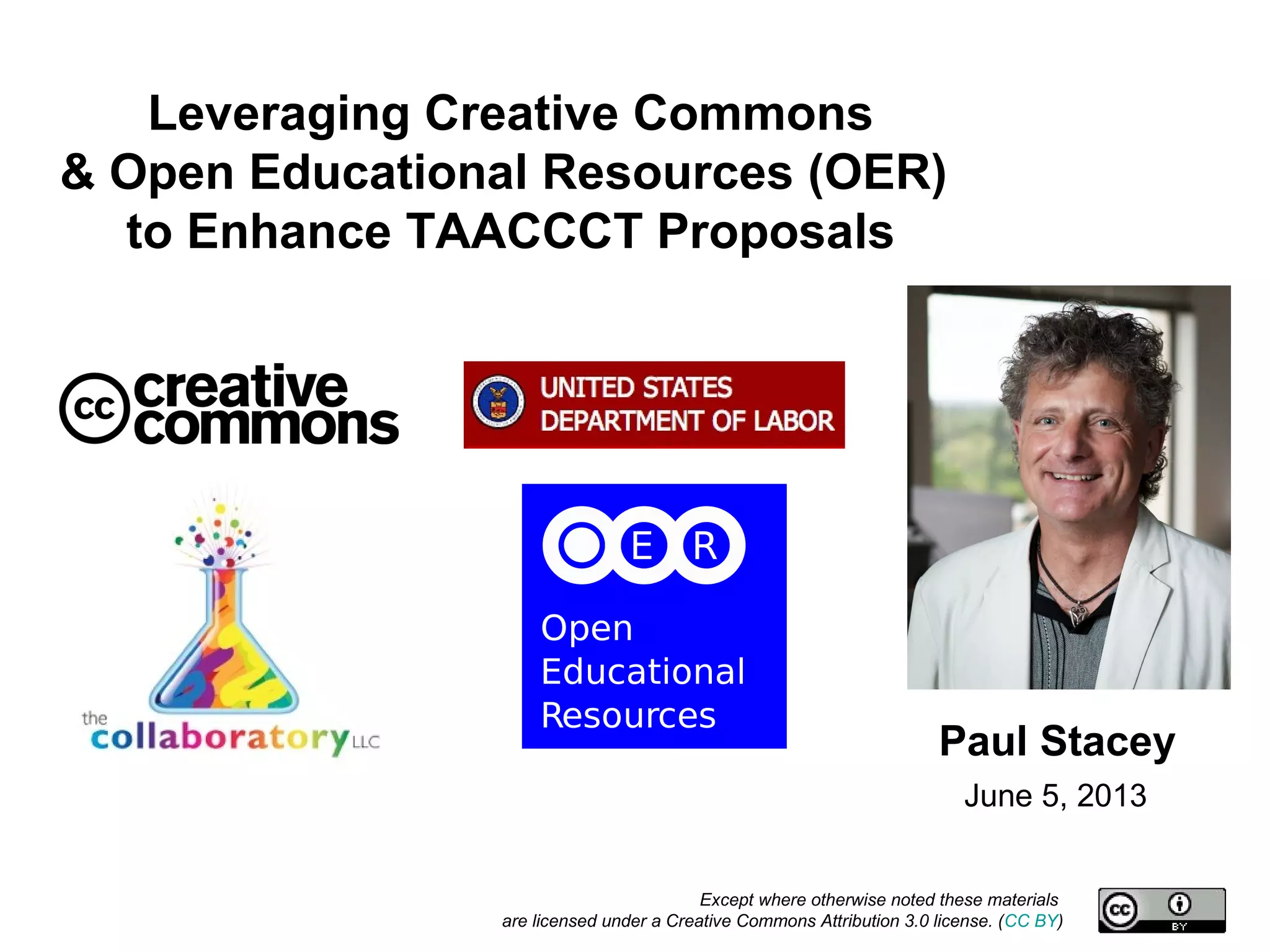 The document outlines the goals and requirements for leveraging Creative Commons and Open Educational Resources (OER) to enhance TAAACCT proposals, focusing on increasing credential attainment and improving employment outcomes for TAA-eligible workers. It emphasizes the necessity for all materials developed with grant funding to be publicly licensed under a Creative Commons Attribution 3.0 license to encourage innovation and accessibility. Key components include the need for evidence-based design, stackable credentials, and collaboration with previously funded projects to avoid duplication.