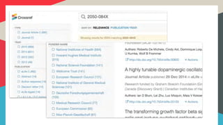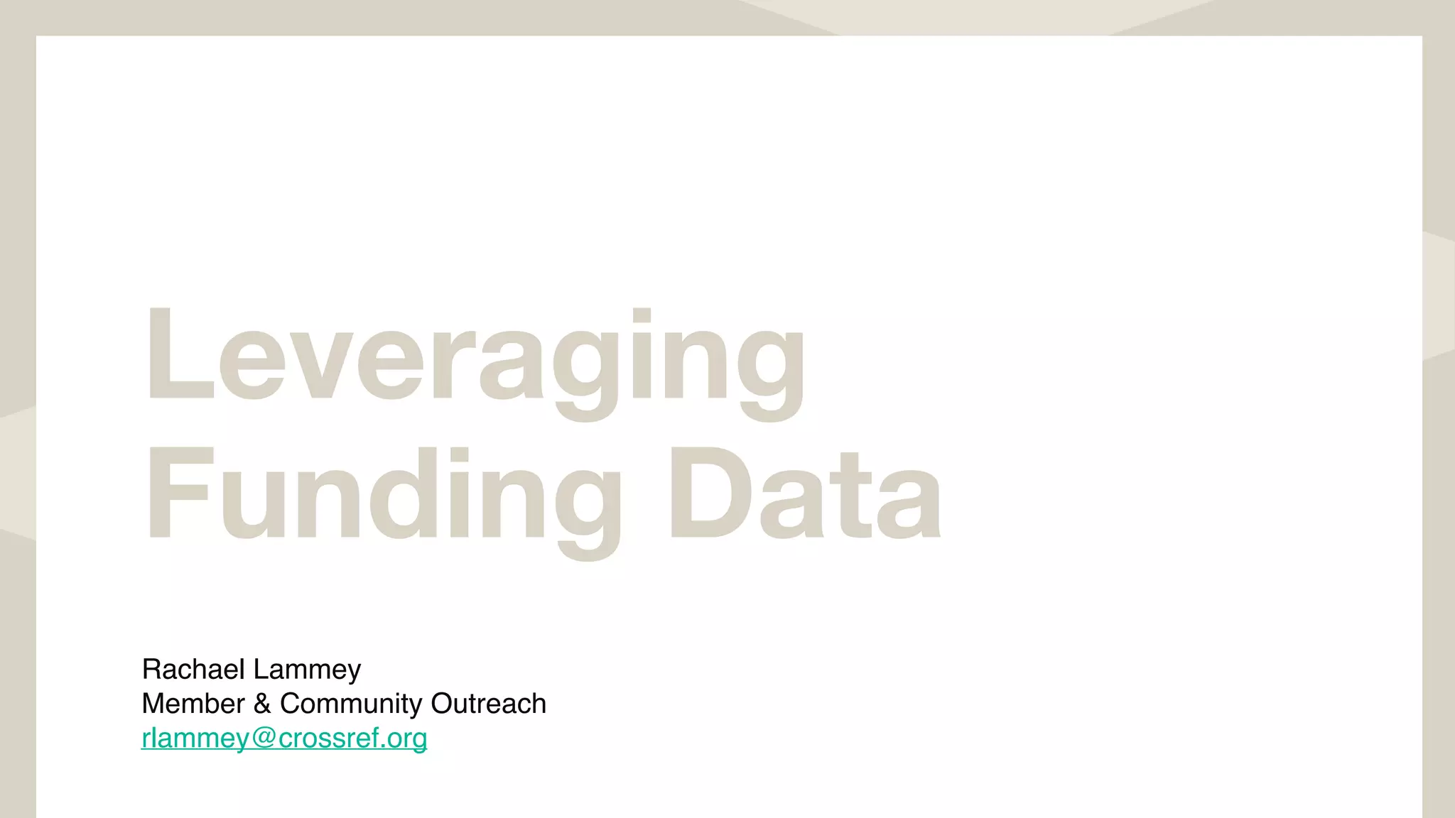 Crossref provides funding data services to help standardize and deposit funder information from published research. This includes using the Open Funder Registry to standardize funder names, having publishers deposit funding metadata, and performing large-scale analysis and reporting of funding information back to funders. Users can access funding data through the Crossref website and API.