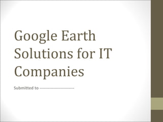 Geo Information & Modeling Solution Pvt. Ltd is a company that provides 3D modeling services on Google Earth. They create high-quality 3D models of buildings, offices, manufacturing plants, and other structures that can be viewed from anywhere in the world on Google Earth. The company uses inputs like drawings and designs from clients to accurately model projects to scale. They also provide additional services like image galleries, videos, and links to integrate the 3D models with clients' websites for marketing purposes. The document provides examples of prestigious projects the company has worked on and outlines the deliverables and process for developing 3D models on Google Earth.