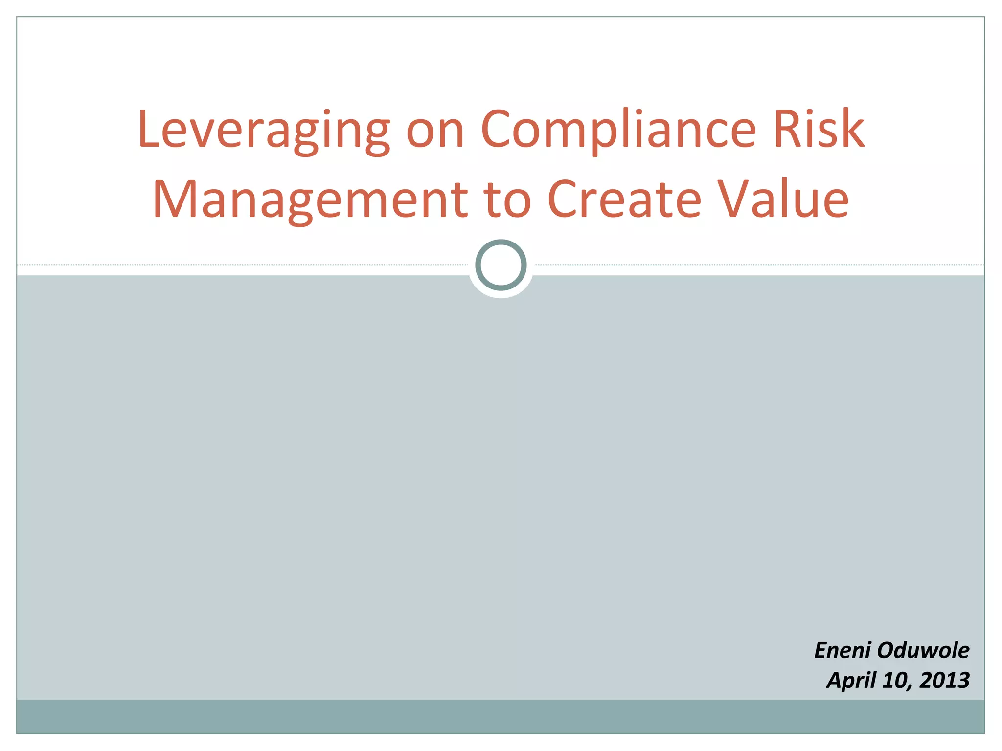 The document discusses leveraging compliance risk management to create value by outlining a risk-based approach to compliance, the functions of a compliance department, and how to develop an effective compliance program through measures like guidance, education, and warnings. It also examines the roles of management and the board, internal and external drivers of compliance risk, and integrating compliance with enterprise risk management.