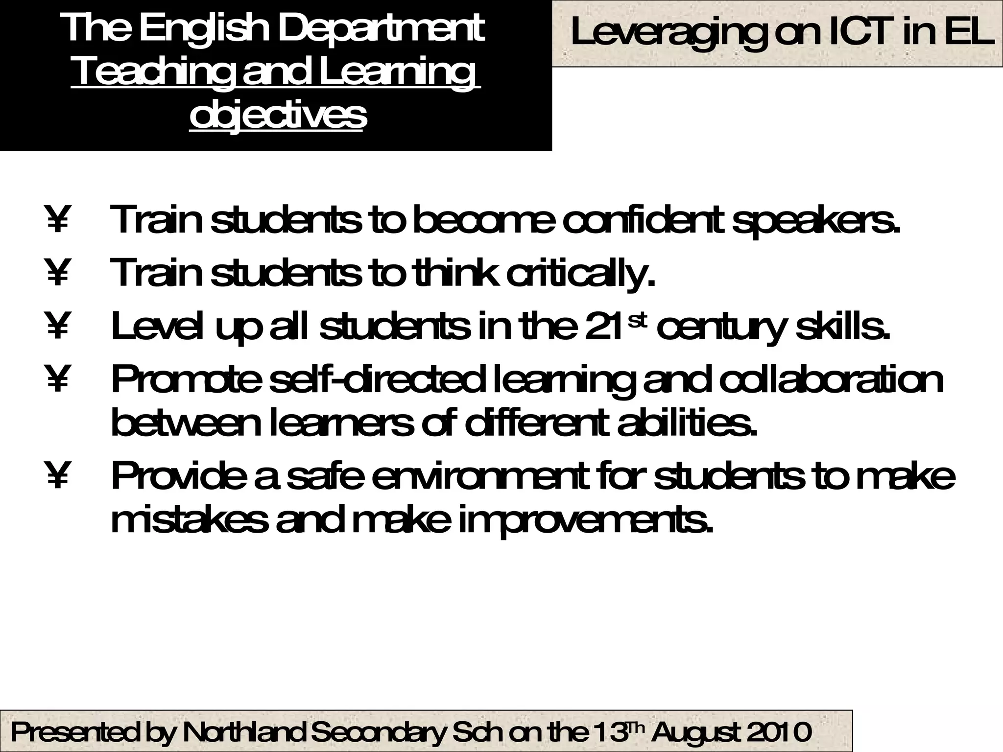 The document discusses leveraging ICT in English language teaching and learning. It describes using e-videos to reinforce skills and allow self-directed learning. Chroma key technology and green screens allow students to create digital stories. Pbworks is proposed as a collaborative platform to provide instruction, assignments, feedback and student engagement through wikis on various English language topics like writing, oral exams, and project-based learning.
