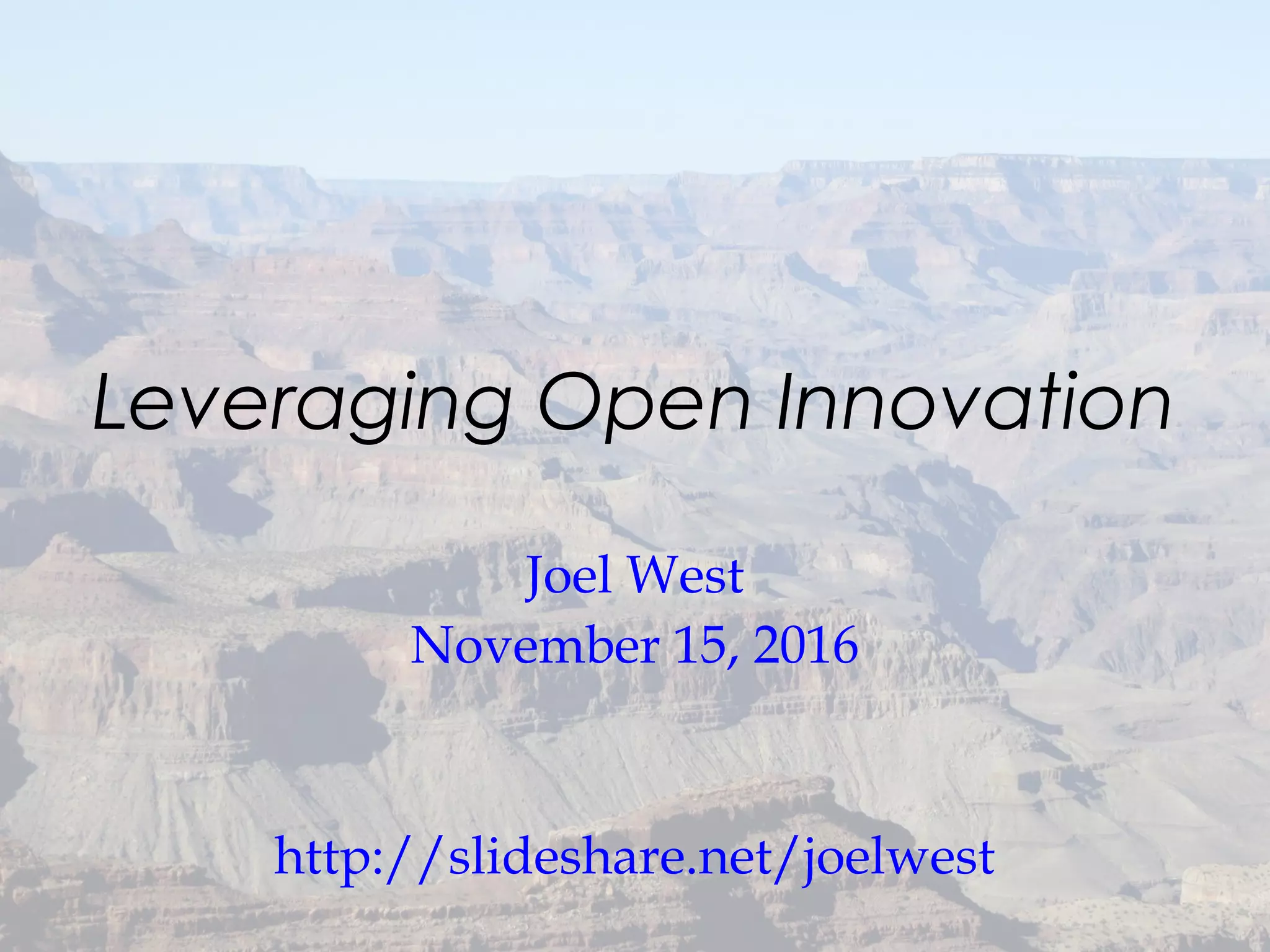 Joel West discusses how open innovation can help firms leverage external knowledge. Open innovation involves purposeful inflows and outflows of knowledge across firm boundaries to accelerate internal innovation. There are different types of open innovation strategies like inbound, outbound, and collaborative openness. Examples include Procter & Gamble's Connect + Develop program that sources one-third of new product technologies externally, and Dolby Labs that commercializes its audio technologies through licensing. Other examples are standards consortia like IETF that develop shared protocols, R&D consortia like ELSIE that share safety data, open source software projects, and crowdsourcing problems through intermediaries like InnoCentive to tap diverse knowledge. Open innovation changes firms' roles