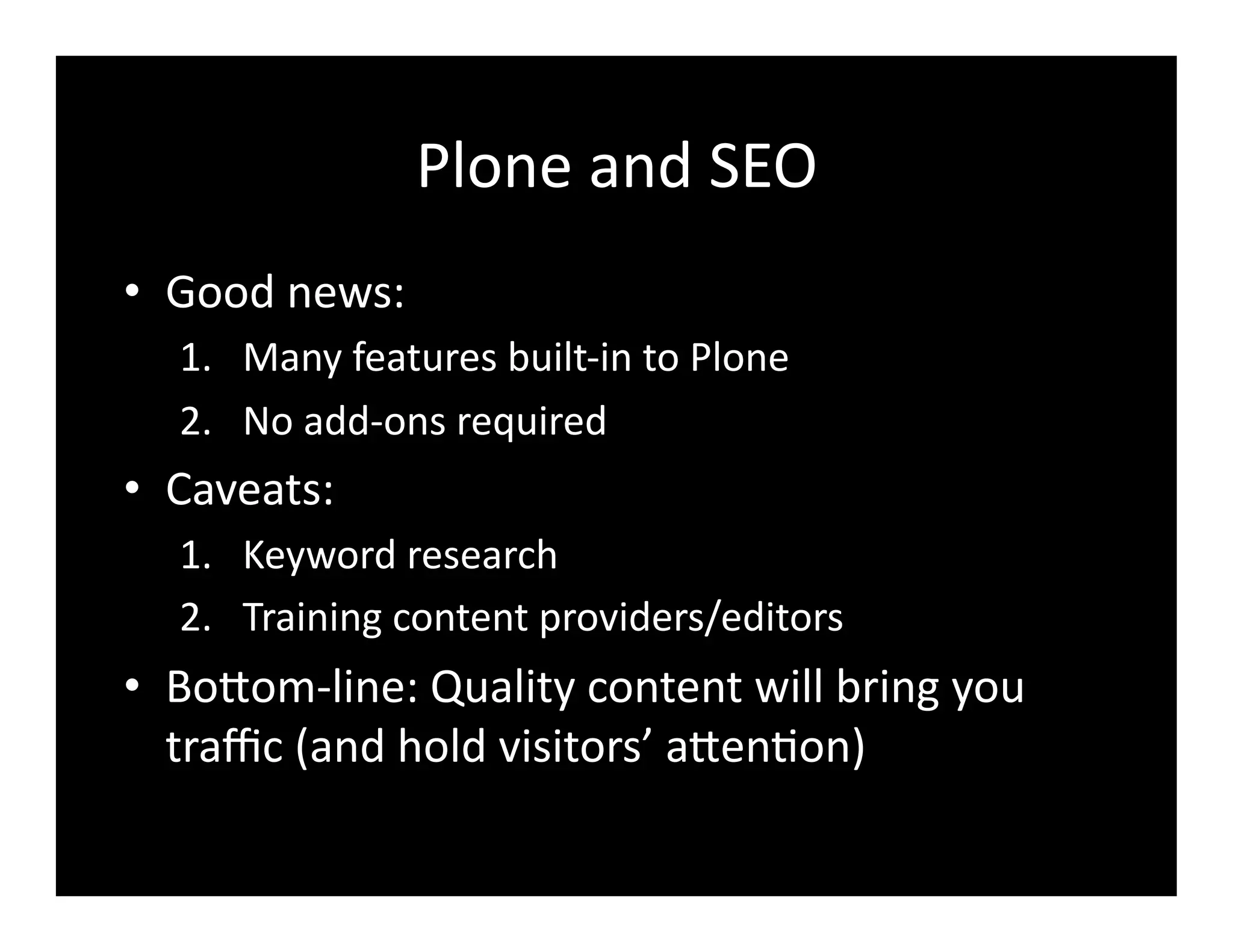 The document outlines strategies for optimizing Plone for search engine optimization (SEO), emphasizing the importance of quality content and proper structuring of web elements such as titles, descriptions, and headings. It highlights the need for keyword research, effective training for content providers, and maintaining clean URLs to improve search engine rankings. Additionally, it advises on site administration practices like using robots.txt, providing a sitemap, and monitoring search statistics.