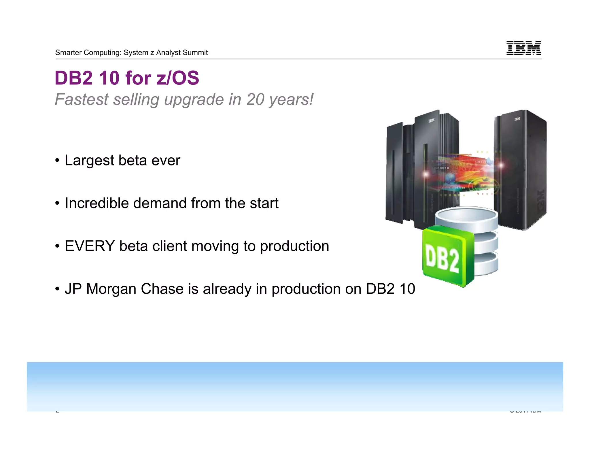 - DB2 10 for z/OS has seen the fastest sales upgrade in 20 years with incredible demand and every beta client moving to production, including JP Morgan Chase.