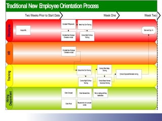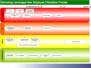 The document discusses leveraging technology to enhance new employee training and course evaluation, emphasizing the importance of a smooth orientation to acclimate new hires. It outlines various technological tools, such as recorded media, online courses, and learning management systems, that can streamline the onboarding process, reducing time and resource expenditure. However, it stresses the necessity of maintaining human interaction to ensure a positive welcoming experience.