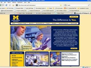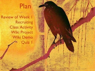 This document outlines the plan for Leveraging Technology Week. It includes reviewing the previous week, conducting recruiting activities and quizzes. It also discusses using social media and video to understand a corporate recruiter's role. The main focus is a wiki class project where student teams will create pages on new hire onboarding, recruiting, an HR information portal, and company information/blog. Guidelines are provided around group responsibilities, labeling pages, and using the wiki software.