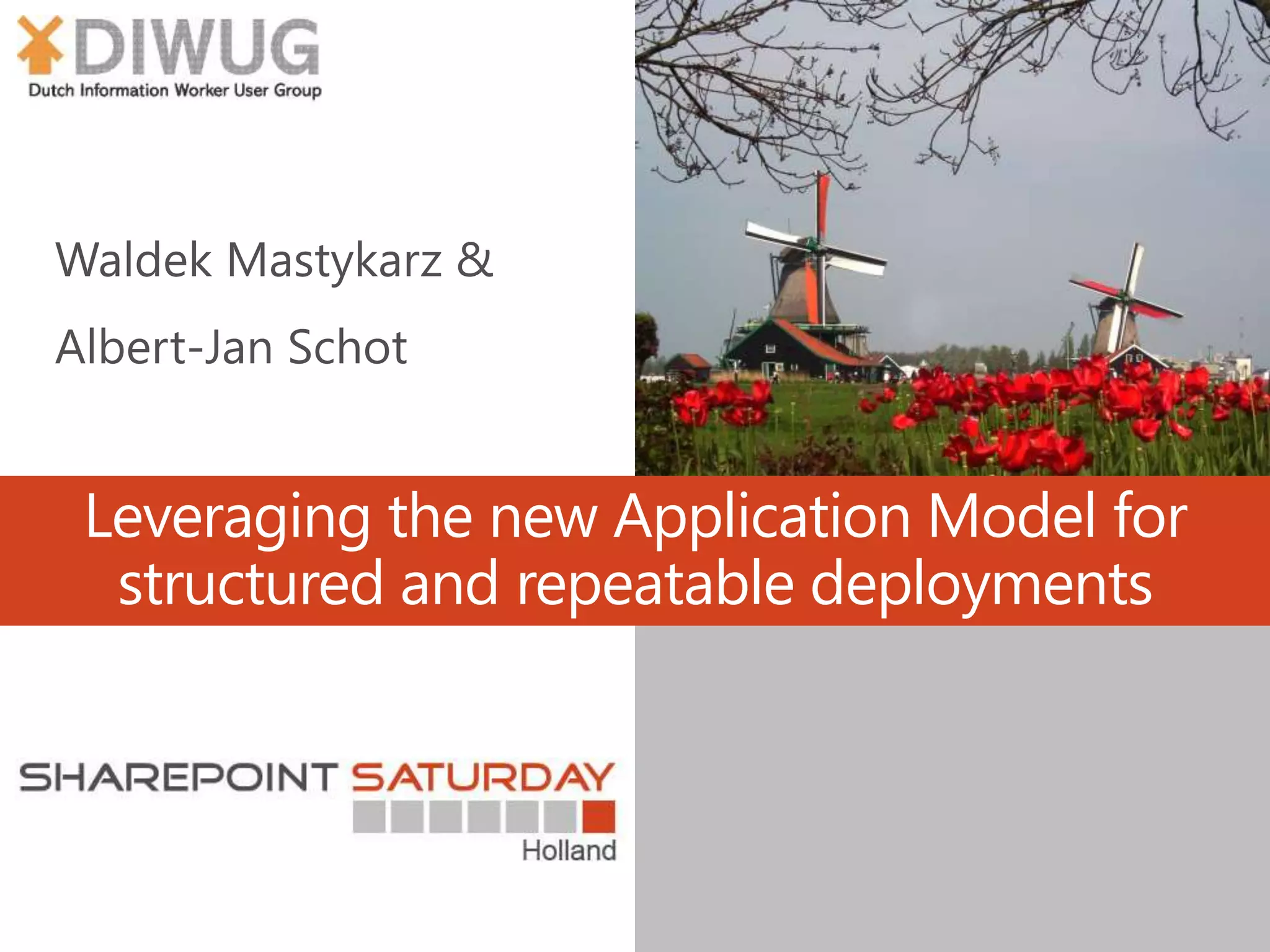 The document discusses leveraging a new application model for structured, repeatable deployments in SharePoint. It outlines various components and processes involved in app deployment, including configuration requests and status management. Additionally, it emphasizes sharing proven patterns and practices to address real-life challenges.