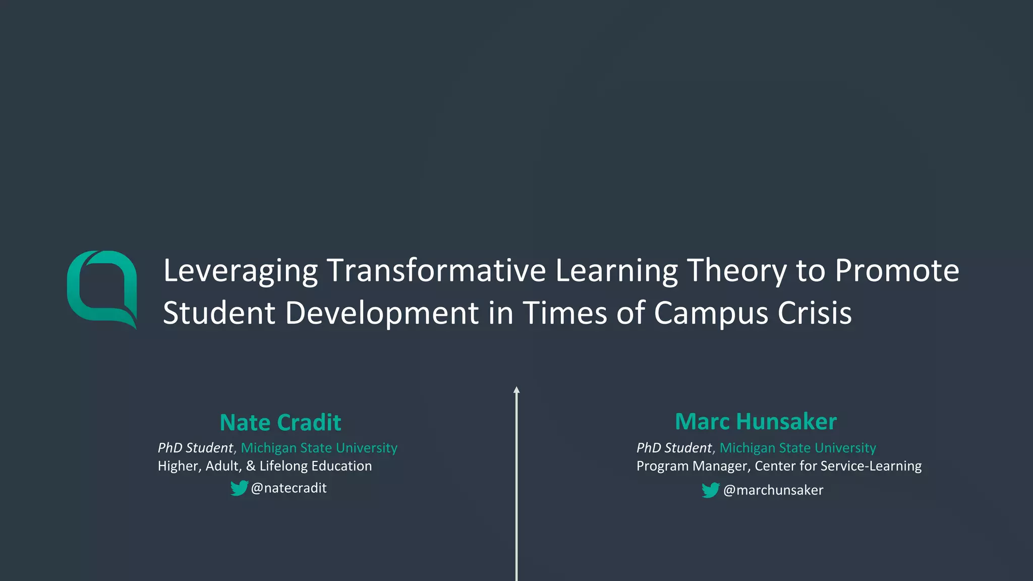 Leveraging Transformative LearningTheory to Promote Student Development in Times of Campus Crisis Nate Cradit PhD Student, Michigan State University Higher, Adult, & Lifelong Education @natecradit Marc Hunsaker PhD Student, Michigan State University Program Manager, Center for Service-Learning @marchunsaker