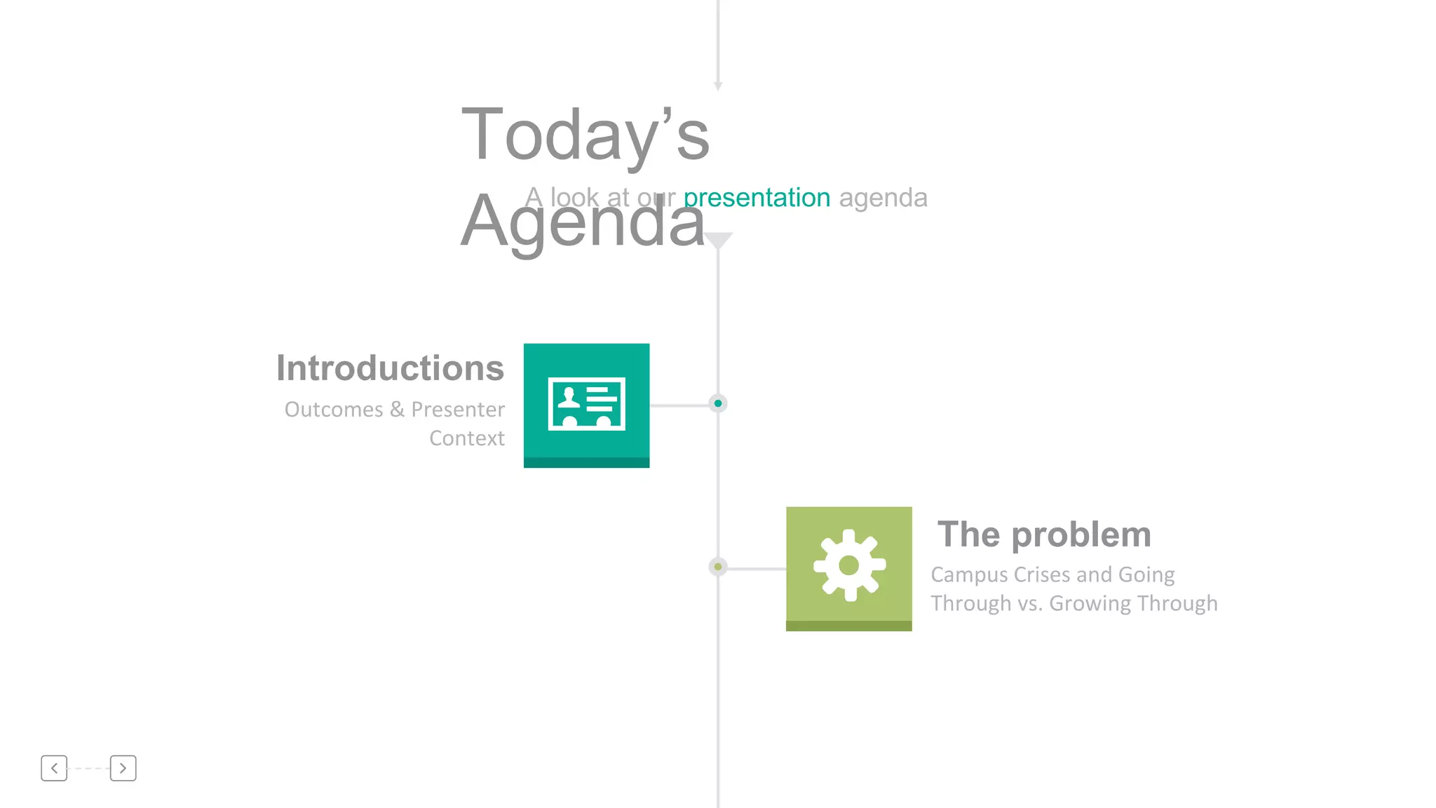 A look atour presentation agenda Today’s Agenda Introductions Outcomes & Presenter Context The problem Campus Crises and Going Through vs. Growing Through
