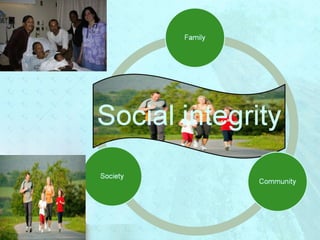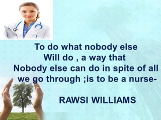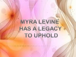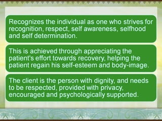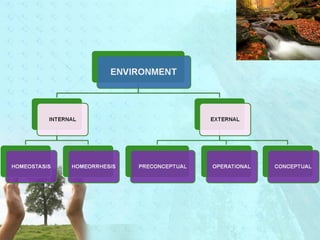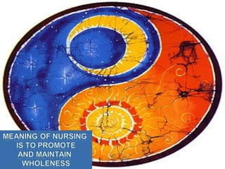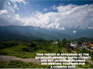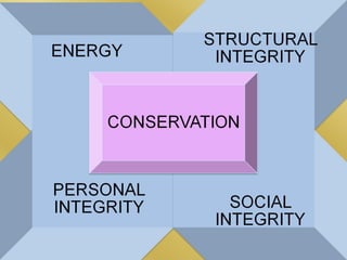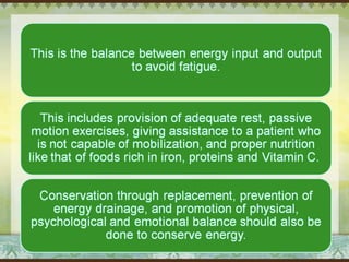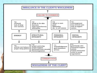 Myra Levine's conservation model of nursing focuses on helping patients adapt to stressors through four principles: conservation of energy, structural integrity, personal integrity, and social integrity. The nursing process involves comprehensive assessment of challenges in these areas, developing a care plan to address needs, implementing interventions, and evaluating responses. Key concepts are that humans strive for wholeness through orderly adaptation to environmental changes and the nurse's role is to create an environment facilitating healing.