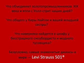Документ описывает историю знаменитых джинсов Levi's 501®, начиная с их создания в 1873 году Леви Строссом и Джейкобом Дэвисом. Уникальность данной модели заключается в прочности, функциональности и разнообразии использованных материалов, что приносит ей популярность среди знаменитостей и модных людей на протяжении более 100 лет. Levi's 501® стали символом стиля и культуры XX века, сохраняя свою актуальность и привлекательность.