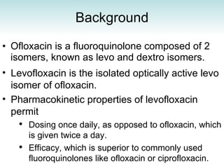 Levofloxacin is the isolated levo isomer of ofloxacin, which allows for once daily dosing. It has superior efficacy to other fluoroquinolones like ofloxacin and ciprofloxacin. Levofloxacin achieves high concentrations in tissues and body fluids, making it effective against common pathogens causing respiratory, urinary, skin and soft tissue infections. It demonstrates rapid bactericidal activity and lower resistance development compared to other fluoroquinolones. Guidelines recommend levofloxacin as first-line therapy for various infections.