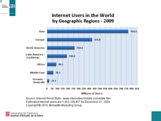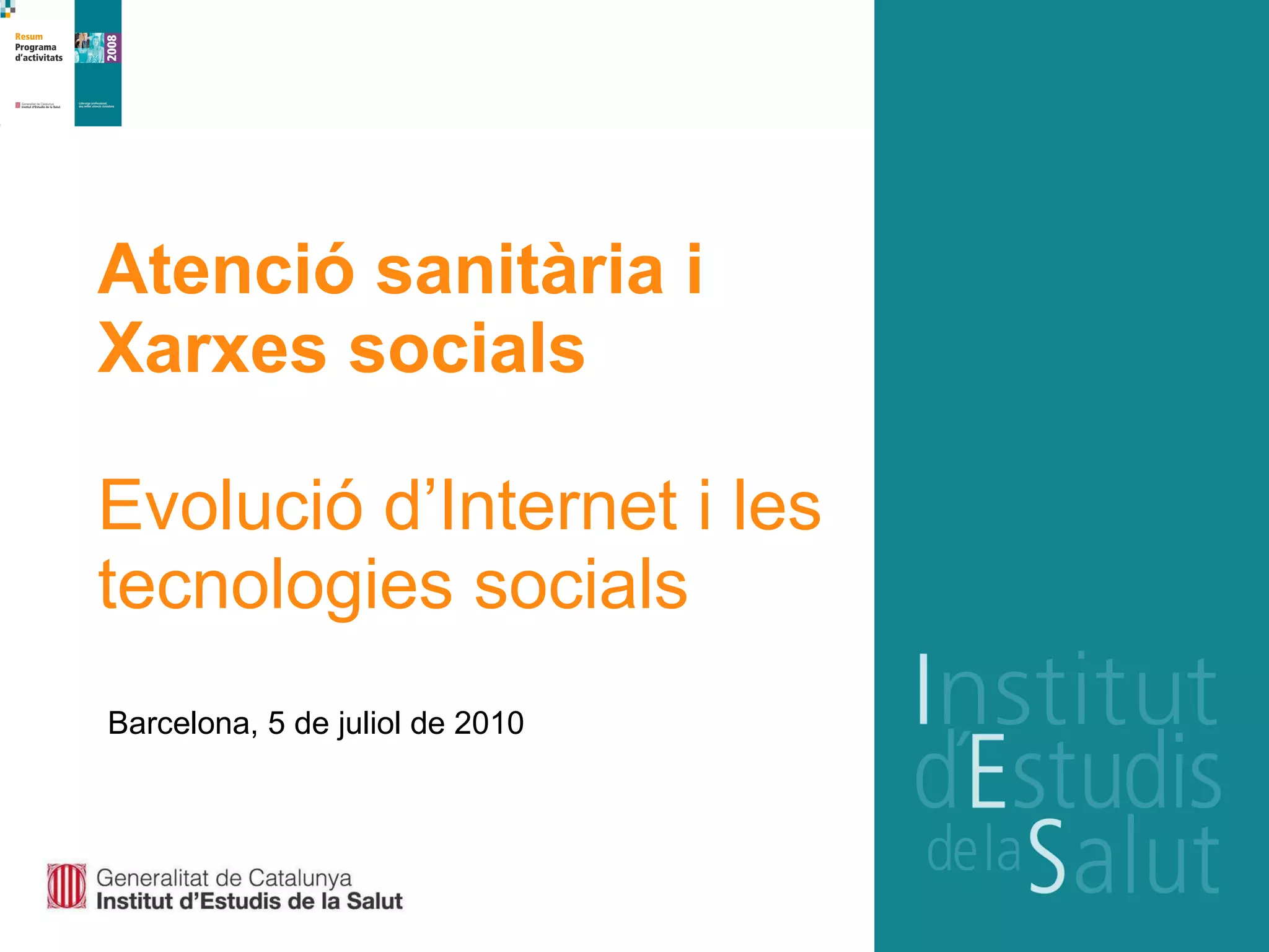 Internet: algunes datesclau ARPANET Agost 1962 You-Tube 2005 Yahoo / Altavista 1995 Mor Marilyn Monroe ARPANET conecta EEUU – Noruega 1973 Google 1998 Bombolla dot.com 2000 Facebook - Twitter 2006 PC IBM 1981 Netscape Accés particular a Internet 1994 WWW Sir Tim Berners-Lee 1989 Cae el muro de Berlín