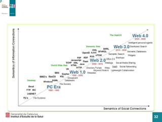 Transició 1.0 a2.0 1.0 2.0 Llegir Escriure Navegar Consumir Connectar Col·laborar Crear Compartir Megas de text i fotos publicats Gigas d'àudio i vídeo compartits Jo consumeixo passivament Nosaltres participem activament