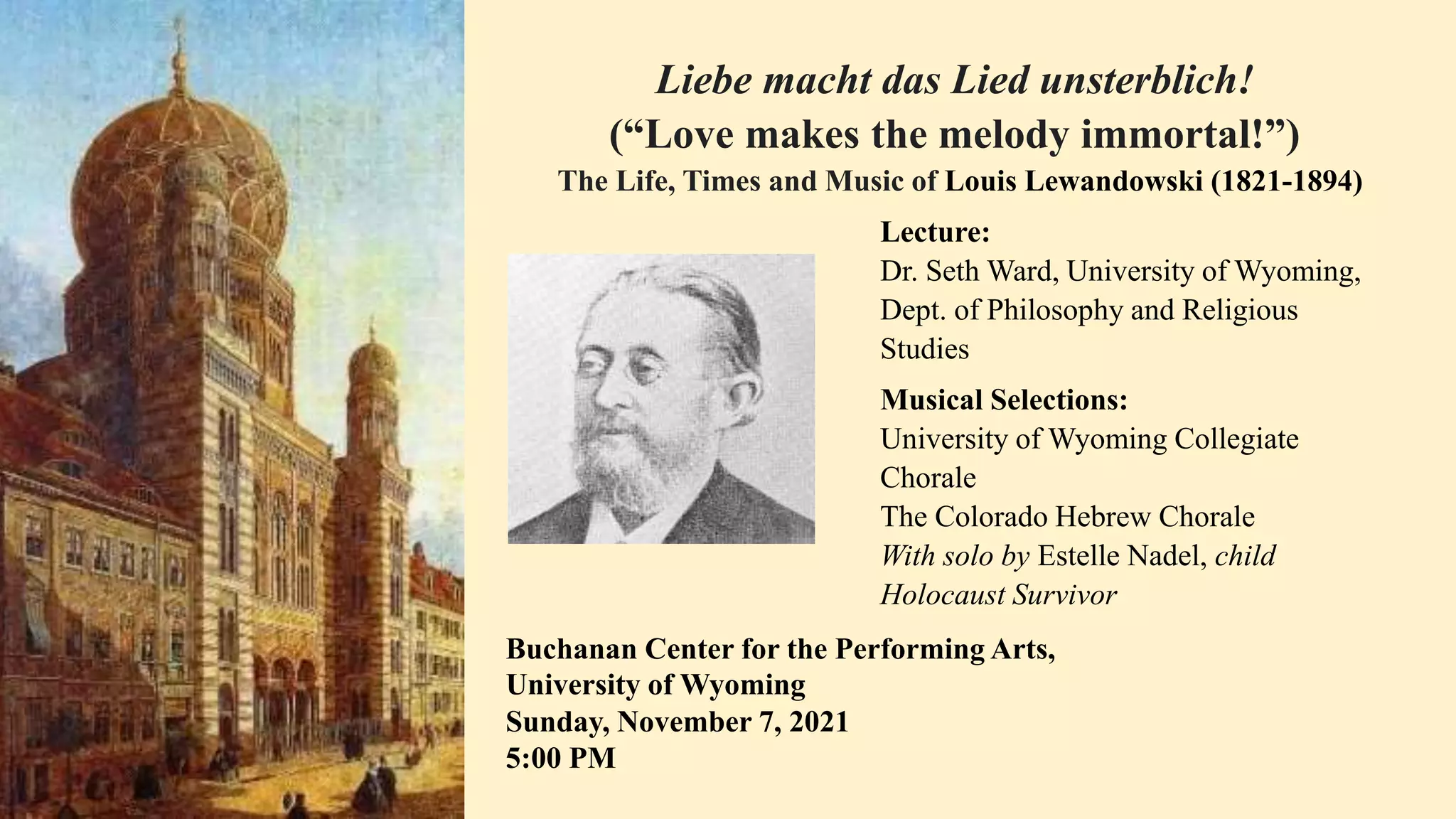 The document is a program for a lecture titled 'Liebe macht das Lied unsterblich!' focusing on the life and music of Louis Lewandowski. It features performances by the University of Wyoming Collegiate Chorale and includes pieces in memory of Lewandowski, Holocaust victims, and those lost to COVID-19. The event took place at the Buchanan Center for the Performing Arts on November 7, 2021.