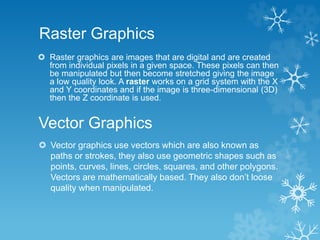 Raster graphics use pixels that can be manipulated but result in lower quality when stretched. Vector graphics use mathematically based paths and shapes that do not lose quality when manipulated. Common file formats include JPEG for compressing images, TIFF for lossless compression, GIF for animations and logos, and BMP for individual pixel editing. Optimizing images reduces file size and improves viewing but also reduces quality. Proper naming conventions and use of folders helps manage and organize graphic assets.