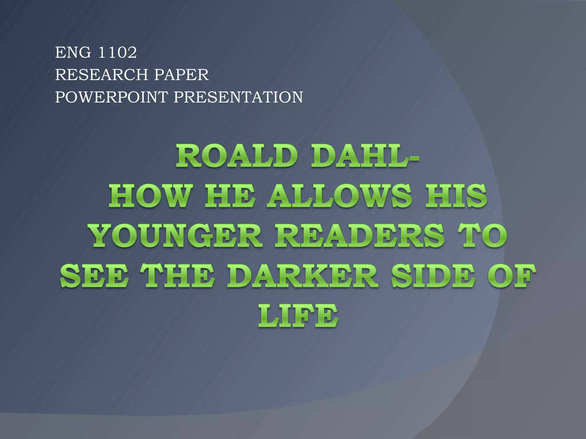 This document provides an outline for a research paper on Roald Dahl's dark writing style for children. It discusses how Dahl's difficult past influenced his work. While children responded positively to his believable characters, many adults disapproved of the disturbing themes. Dahl enjoyed challenging children and society's norms. Examples of his famous books that showed a darker perspective of life are provided.
