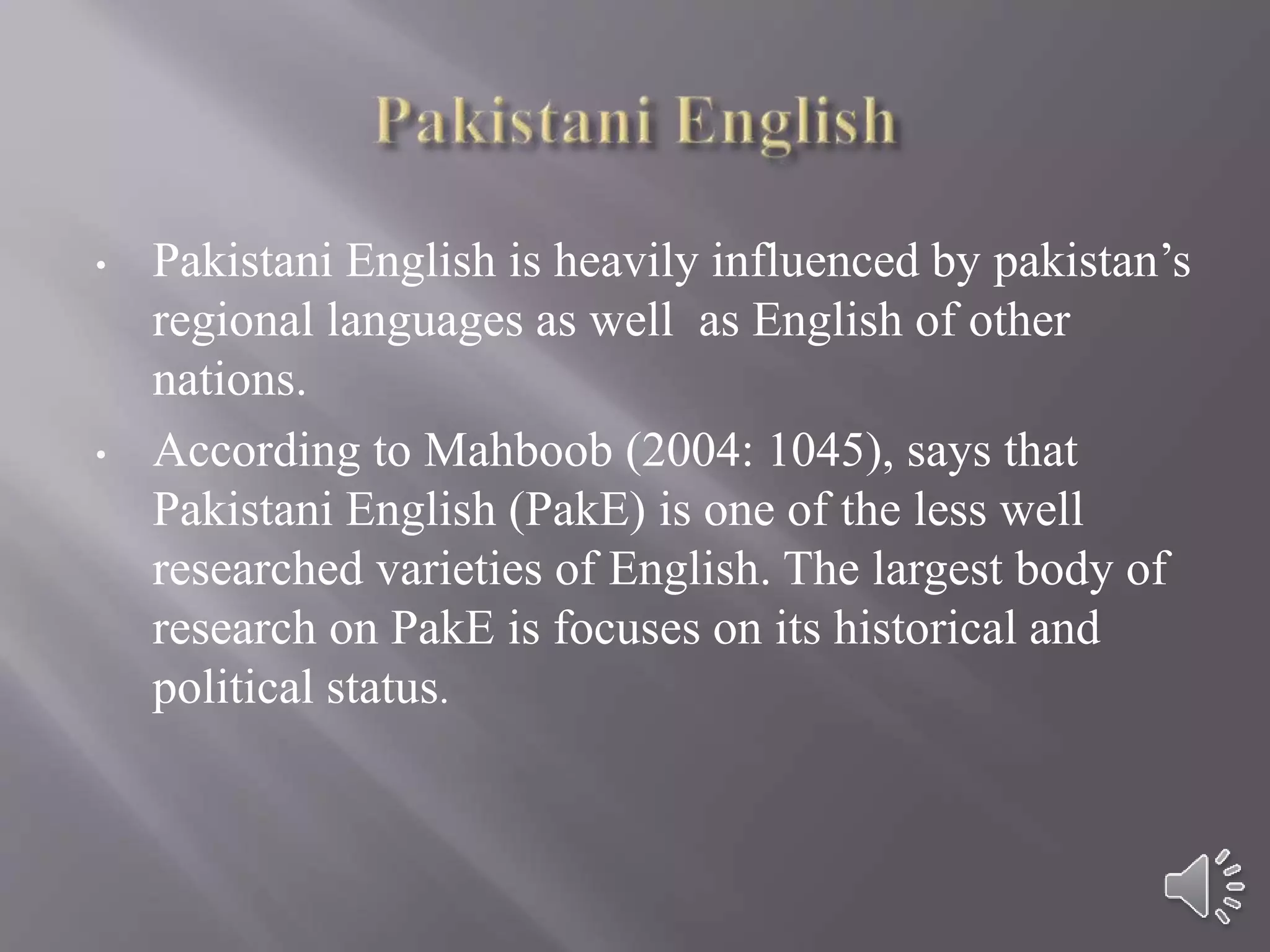 Pakistani English (Pake) is influenced by regional languages and reflects Pakistan's unique cultural and religious identity. Research indicates that Pake incorporates local vocabulary, borrowed terms, and semantic shifts, particularly related to Islamic culture. It is characterized by hybridization and non-native lexical items, making it distinct from both Indian and British English varieties.