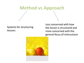 A lexical approach to language teaching focuses on helping students acquire vocabulary rather than emphasizing grammar structures. It views language as consisting of lexical elements in addition to traditional grammar. Examples provided illustrate how activities can be adapted to focus on different lexical structures involving a particular word, like "get". Songs are also identified as a rich source of lexical chunks that students should learn as units rather than individual words. Specific lines from songs are analyzed to show this.