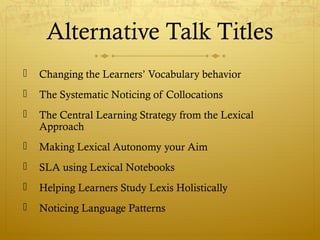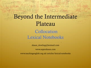 The document discusses strategies for helping language learners transition from intermediate to advanced levels, emphasizing the importance of collocational competence and the use of lexical notebooks. It outlines a structured approach to introducing and maintaining these notebooks in the classroom, with evidence showing improved vocabulary retention among students who actively engaged with the method. Additionally, it highlights challenges and considerations for implementing lexical notebooks effectively.