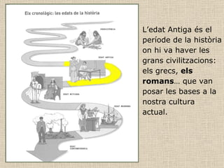 L’edat Antiga ésel període de la història on hi va haver les grans civilitzacions: els grecs, els romans … que van posar les bases a la nostra cultura actual.