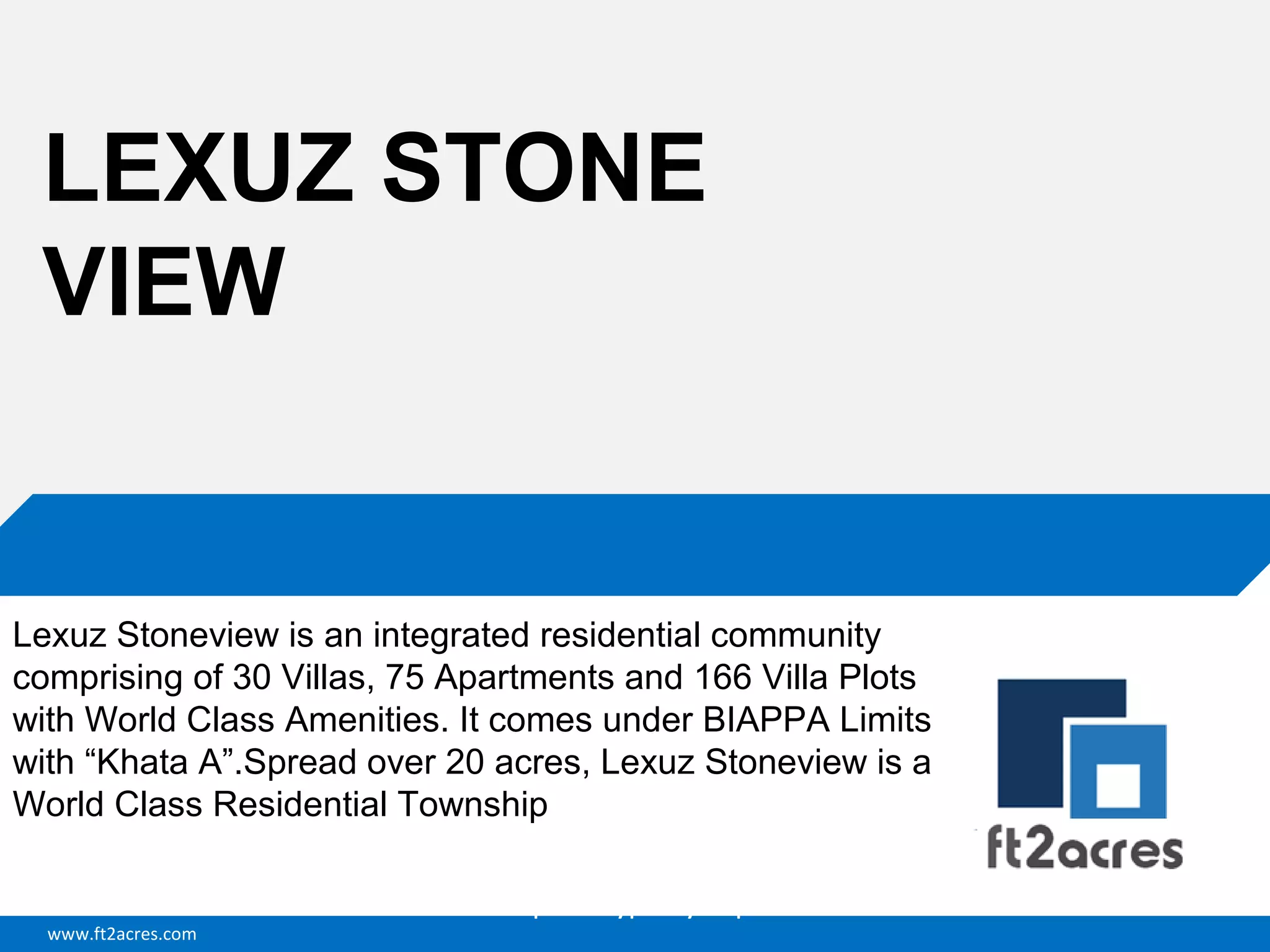 Lexuz Stoneview is an integrated residential community located in Hebbal, Bangalore comprising 30 villas, 75 apartments, and 166 villa plots spread over 20 acres. It features world-class amenities like indoor games, landscaped parks, security intercom, rainwater harvesting, and a jogging track. The properties range in size from 1000 to 5400 square feet with 2-3 bedrooms and 2-3 bathrooms. Prices start at INR 3,100,000. More details can be found at http://www.ft2acres.com/property/lexuz-stoneview-hebbal-bangalore/.