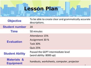 1. The lesson plan objective is for students to be able to create clear and grammatically accurate descriptions.