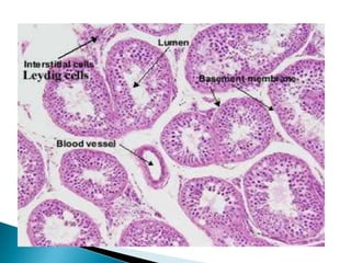 Leydig cells are found in the testicles and produce the hormone testosterone when stimulated by luteinizing hormone from the pituitary gland. They release testosterone and other androgens which leads to male characteristics. Leydig cells have a polyhedral shape with a large nucleus and lipid-filled vesicles. They are named after Franz Leydig who discovered them in 1850.