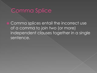 The document discusses various types of grammatical errors involving sentence structure - comma splices, sentence fragments, nonparallel structure, and run-on sentences. It provides examples of incorrect sentences for each type of error and explains how to fix each one, such as by replacing commas with semicolons, dividing sentences, adding subjects or verbs, balancing structure, and separating clauses.