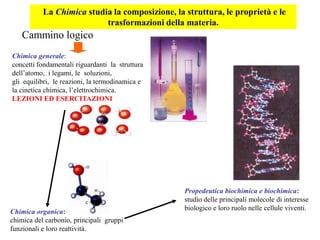Il documento tratta della chimica, descrivendo la sua struttura, proprietà e trasformazioni della materia, coprendo argomenti come la chimica generale, organica e biochimica. Viene analizzato il modello scientifico e le leggi quantitative fondamentali della chimica, inclusa la teoria atomica di Dalton e le leggi di conservazione delle masse. Si evidenziano anche le applicazioni della chimica nella medicina e i concetti di isotopi e molecole.