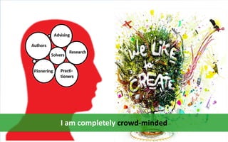 This document discusses the concept of crowdsourcing and its importance for businesses. It notes that crowdsourcing is a major shift in marketing that changes everything by allowing customer participation. The document provides three pointers for making best use of crowdsourcing for R&D, including knowing your crowd, making participation fun and creative, and creating the right mindset.