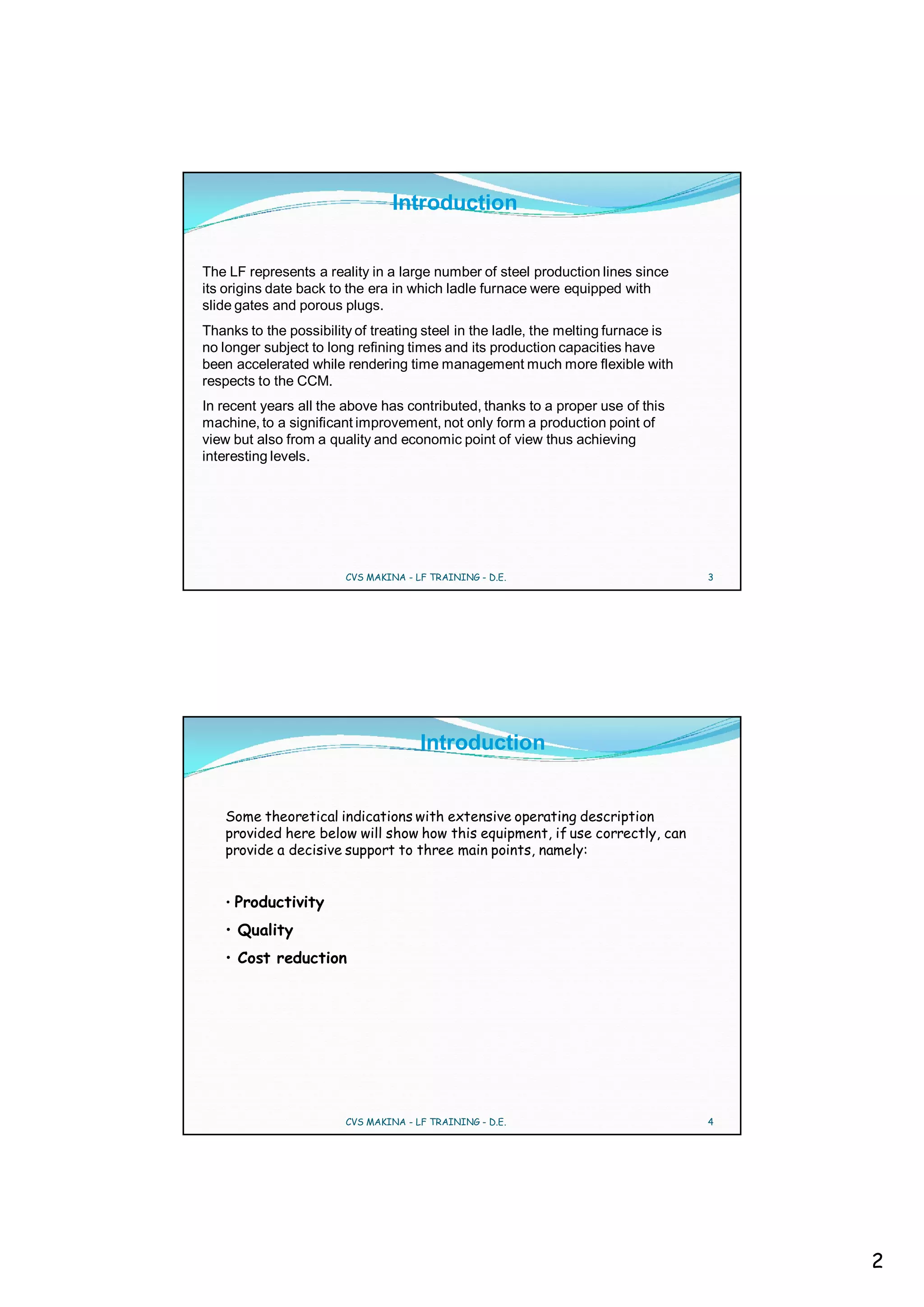 2. Key factors for the LF include proper desulfurization, homogenization through porous plugs, maintaining accurate analyses, and achieving cleaner steel through temperature changes and calibrated stirring.