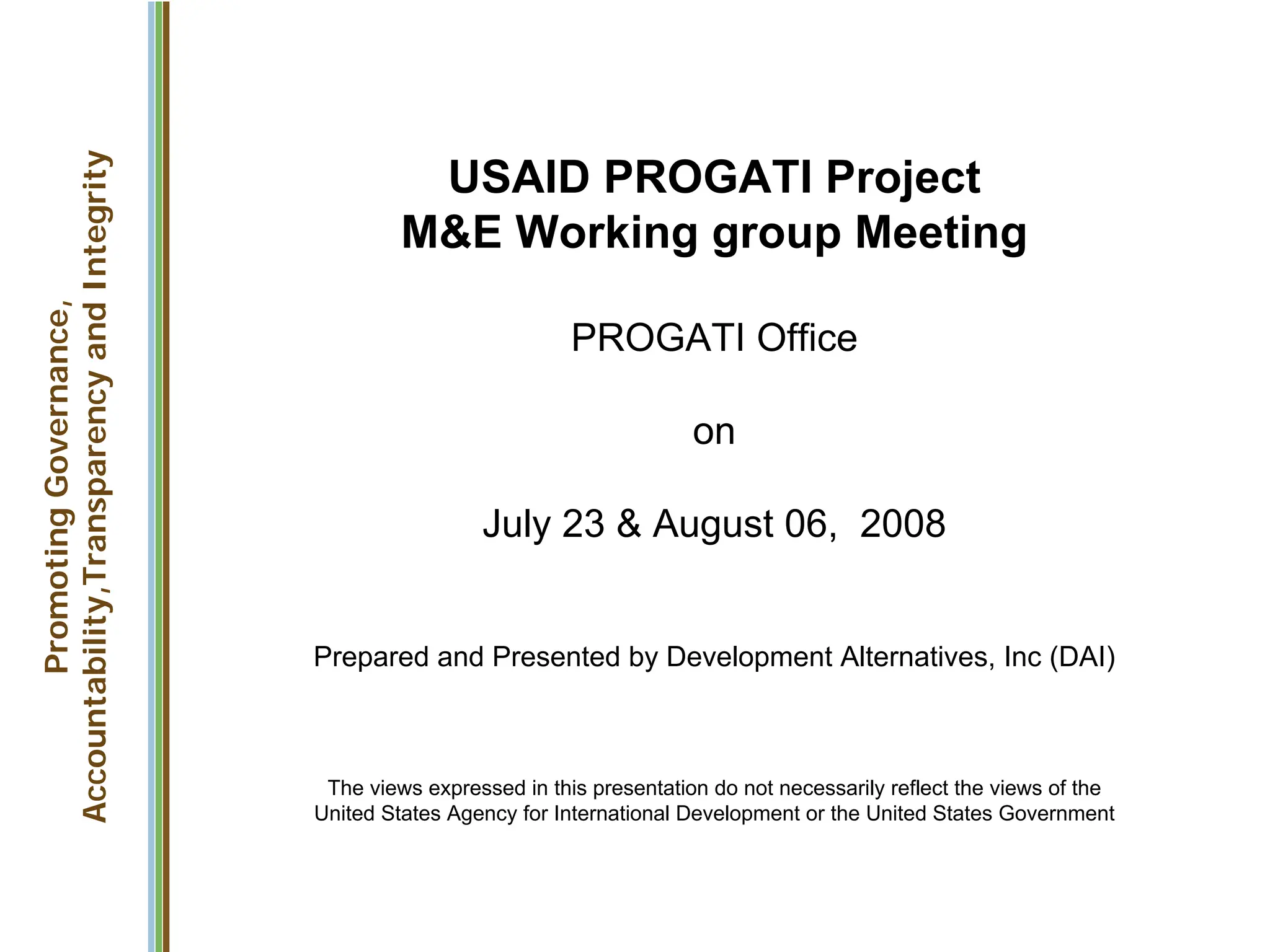The document summarizes a USAID PROGATI Project M&E Working Group meeting. It discusses monitoring and evaluation frameworks, including defining goals, objectives, outputs, activities, and indicators. It describes the different types of indicators such as input, output, outcome, and impact indicators. It also covers principles for selecting good indicators, such as making them specific, measurable, attainable, relevant and timely. The document provides information to help design effective M&E systems and select appropriate indicators to track project progress and results.